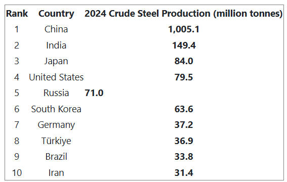 The report of 2025 report of the World Steel Association (WSA) shows the biggest steel producers in the world: