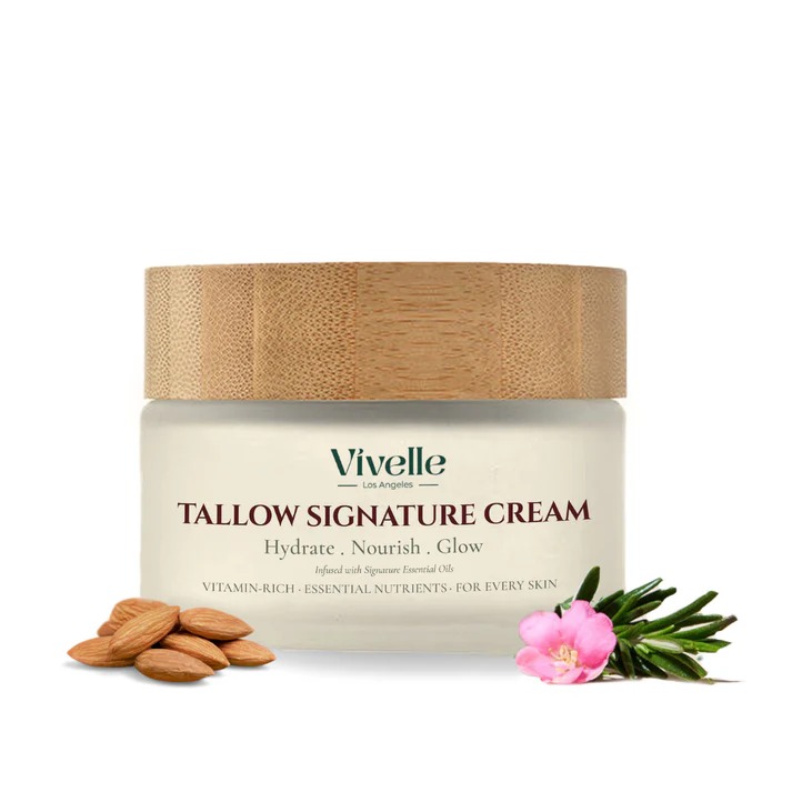 Restore, replenish and protect with our classic Tallow Signature Cream, the foundation of the Vivelle ritual. This cushion-like mousse is crafted from premium 100% grass-fed beef tallow and blended with jojoba and sweet almond oils, creating a velvety texture that melts effortlessly into the skin. With every application, hydration is locked in, your natural barrier is supported, and complexion feels smoother and radiant.